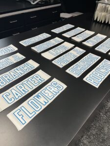For 2023, STAHLS’ Decorating Fulfillment Center (DFC) prepared pre-spaced and ready-to apply names of rostered athletes prior to the NFL Draft. There were 17 athletes attending the first round that year. There are 32 NFL teams, and STAHLS’ prepared a quantity of two names per player, just in case anything unexpected happened.